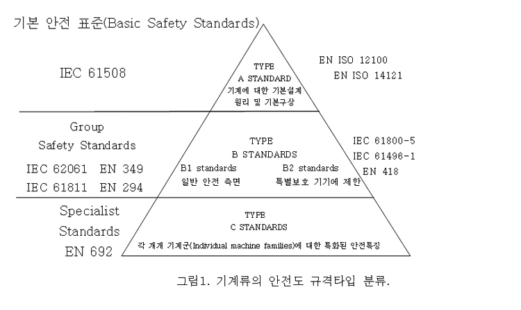 이 유럽의 기계와 기계설비의 지침서는 여러 종류의 위험도로부터 운용자를 보호하기 위하여 기계의 위험도 평가와 안전 시스템의 실현화를 위해 유럽표준 위원회(European Committees for Standardization) CEN과 CENELEC는 기술적인 요구사항들을 지시서의 내용들로 변경하는 일련의 표준화를 이슈화 했다. 이 이슈화된 기계류의 안전표준화는 크게 세 종류의 그룹으로 구분된다. 그룹 A는 기본적인 안전기능의 요구사항을 충족해야 되는 그룹, 안전전문그룹 규격으로 기계류의 서로 다른 그룹 및 종류에 대한 상세한 안전측면에 대한 내용을 포함. 그리고 규격 C는 단일 기계류의 규격으로 모든 중요한 위험에 대한 보호조치 및 상세한 요구 사항 등을 포함한다. 이를 아래 그림에 나타내었다.