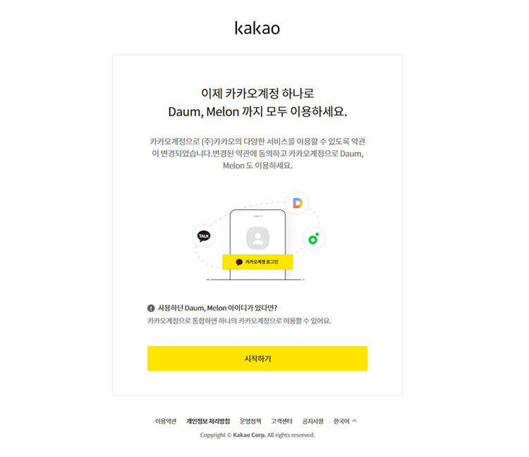 그러면, 카카오계정으로의 통합에 따른 안내문이 이어진다.