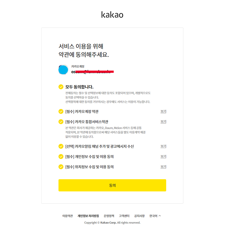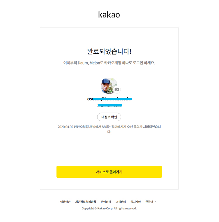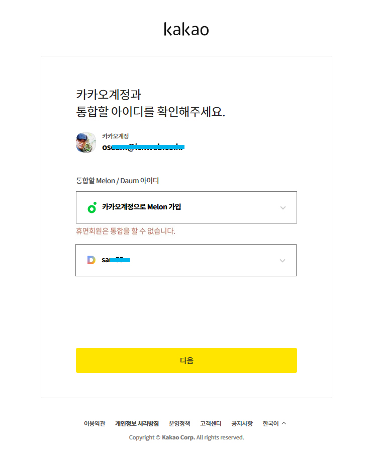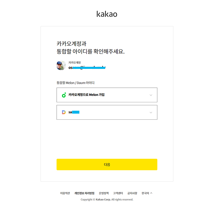 이제 다시, 처음으로 돌아가서 다시 카카오계정으로 통합하기를 진행하면 된다.