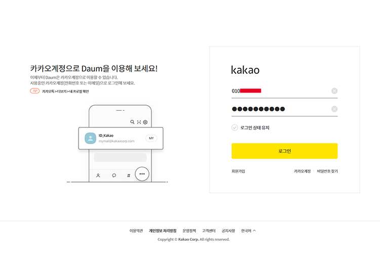위에서 경고했듯, 기존 다음계정 및 멜론계정으로는 로그인이 안 된다.