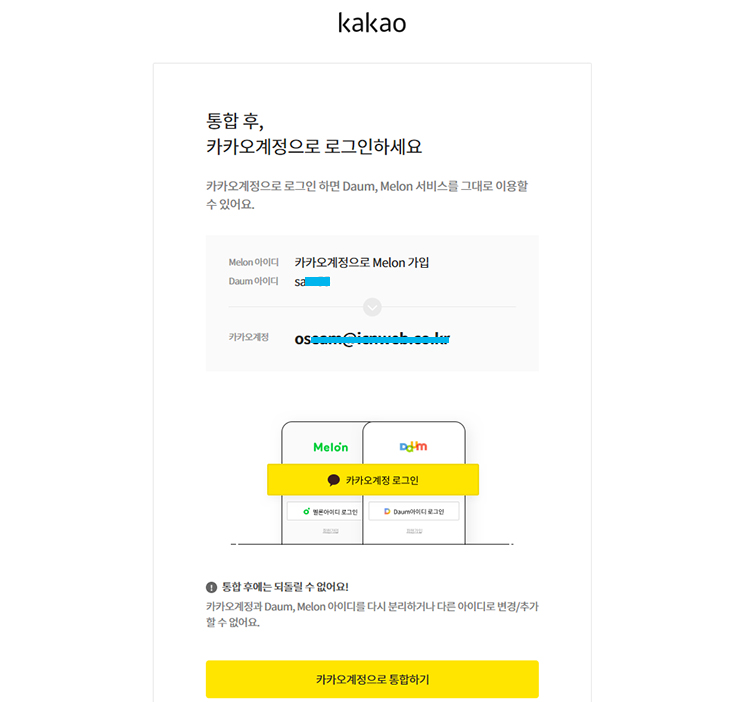 위 3가지 사이트를 카카오계정으로 통합해 사용하게 된다. 한번 통합하면, 다시 분리 복귀는 불가능하기에,,,,