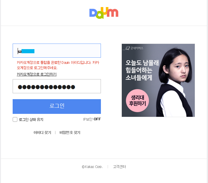 아래 이미지는 기존 다음 이메일 아이디로 로그인을 시도했더니,,,,, 나오는 안내문!!