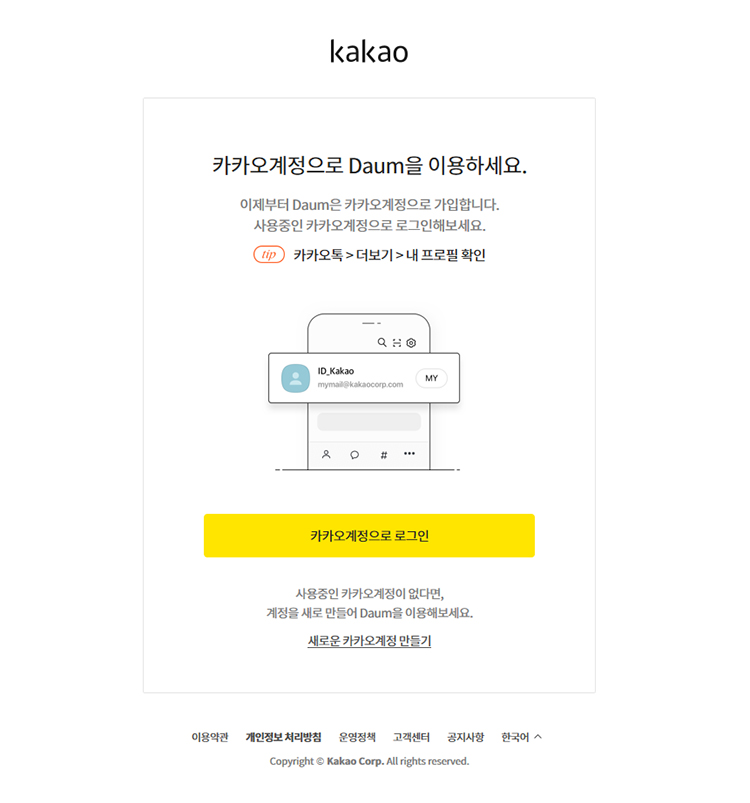 다음 포털에 새롭게 회원가입을 하려면, 이제 카카오계정으로 가입해야 한다. 또한 기존의 다음계정들도 카카오계정으로 통합해 사용이 가능하다. 카카오는 적극적으로 다음계정의 카카오계정 으로의 통합을 유도하고 있다.