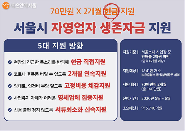 서울시가 코로나 보릿고개라는 절박한 현실에 맞닥뜨린 영세 자영업자·소상공인을 위해 ‘자영업자 생존자금’을 월 70만원씩 2개월간 현금으로 긴급 지원한다. 서울시에서 영업중인 연간 매출액 2억원 이하 자영업자 및 소상공인이 대상이다.