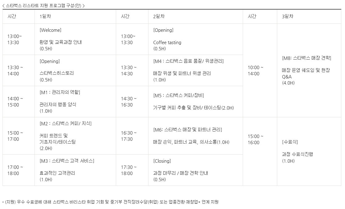 ◦ (내용) 커피 트렌드 및 지식, 매장실습, 스타벅스 고객 서비스, 매장 위생관리, 멘토링 등