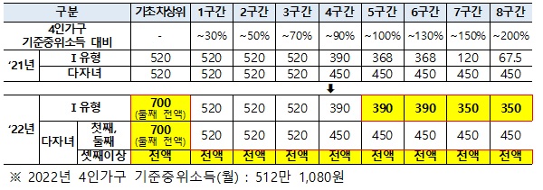 올해(2022년도) 4인가구 기준 평균 소득인정액은 512만 1080원이다.
